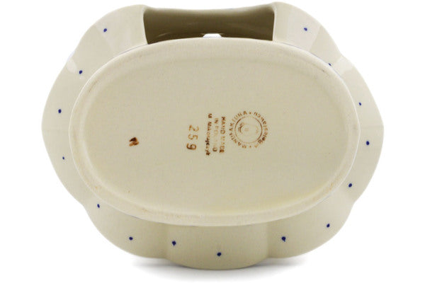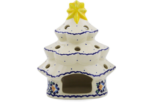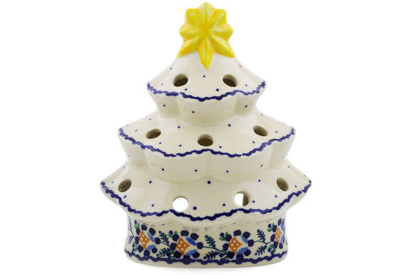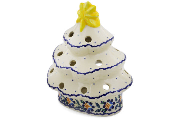 This Polish Pottery Christmas Tree Candle Holder is handmade and handpainted by the Manufaktura factory in Boleslawiec, Poland. Manufacturer item number H2906K. It is 7½" high and measures 6¼" by 4¾". The weight of this Christmas Tree Candle Holder is 1.7 lbs. It is part of the Orange And Blue Flower Collection.