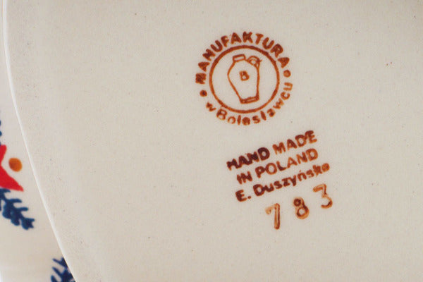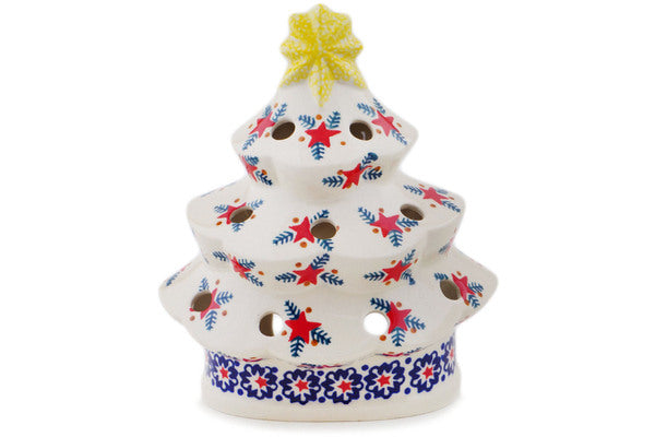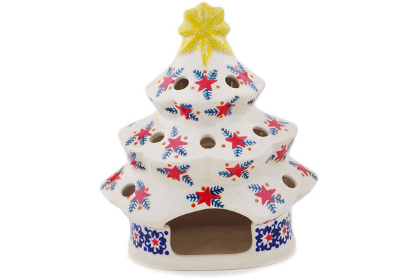 This Polish Pottery Christmas Tree Candle Holder is handmade and handpainted by the Manufaktura factory in Boleslawiec, Poland. Manufacturer item number H8459Q. It is 7½" high and measures 6¼" by 4¾". The weight of this Christmas Tree Candle Holder is 1.7 lbs. It is part of the Starry Wreath Collection.
