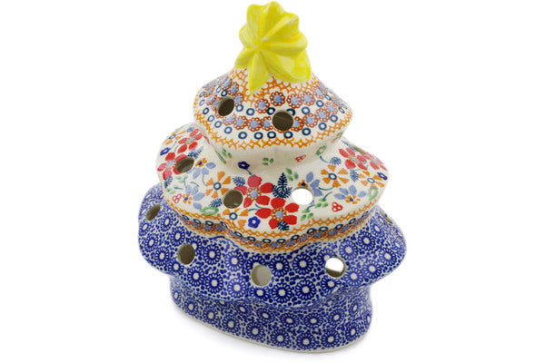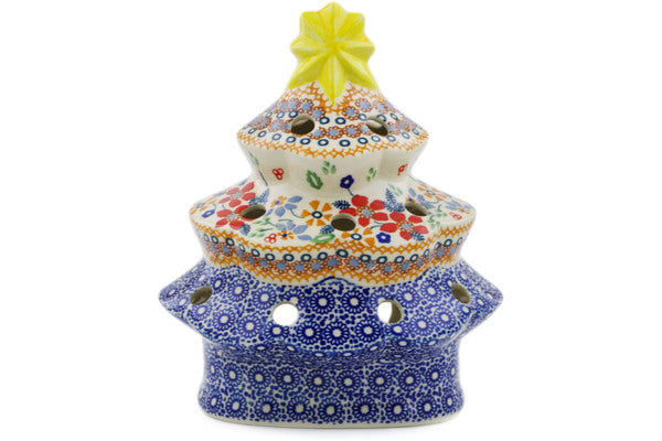 This Polish Pottery Christmas Tree Candle Holder is handmade and handpainted by the Manufaktura factory in Boleslawiec, Poland. Manufacturer item number H6560K. It is 7½" high and measures 6¼" by 4¾". The weight of this Christmas Tree Candle Holder is 1.7 lbs. It is part of the Summer Bouquet Collection.