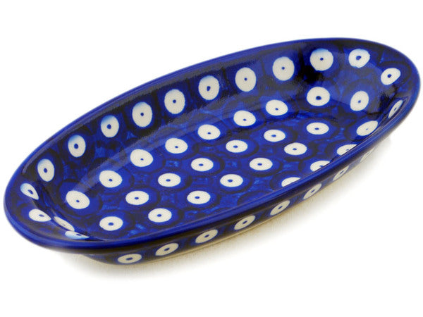 This Polish Pottery Condiment Dish is handmade and handpainted by the Ceramika Bona factory in Boleslawiec, Poland. Manufacturer item number H0710R. It is 1¼" high and measures 7¼" by 3½". The weight of this Condiment Dish is 0.5 lbs. It is part of the Blue Eyed Peacock Collection.