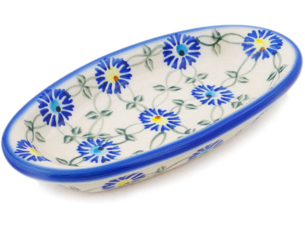 This Polish Pottery Condiment Dish is handmade and handpainted by the Ceramika Bona factory in Boleslawiec, Poland. Manufacturer item number H9796Q. It is 1¼" high and measures 7¼" by 3¾". The capacity of this Condiment Dish is 5.58 oz (brimful) and it weighs 0.5 lbs. It is part of the Blue Thistle Beauty Collection.