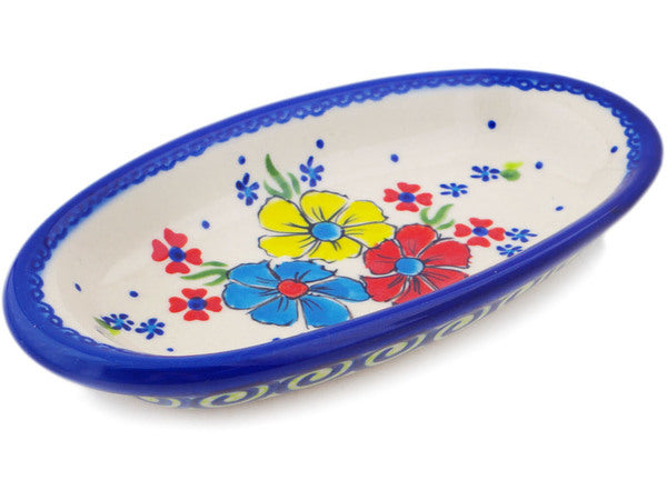 This Polish Pottery Condiment Dish is handmade and handpainted by the Ceramika Bona factory in Boleslawiec, Poland. Manufacturer item number H2120R. It is 1¼" high and measures 7¼" by 3¾". The capacity of this Condiment Dish is 5.58 oz (brimful) and it weighs 0.5 lbs. It is part of the Country Three Collection.