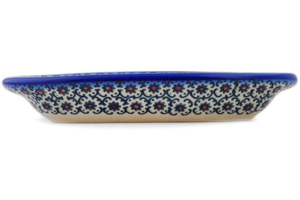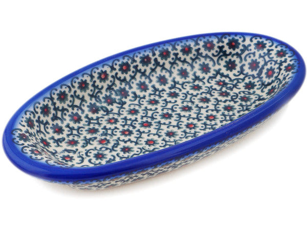 This Polish Pottery Condiment Dish is handmade and handpainted by the Ceramika Bona factory in Boleslawiec, Poland. Manufacturer item number H9729Q. It is 1¼" high and measures 7¼" by 3¾". The capacity of this Condiment Dish is 5.58 oz (brimful) and it weighs 0.5 lbs. It is part of the Field Of Black Daisies Collection.