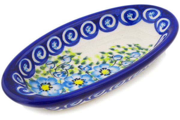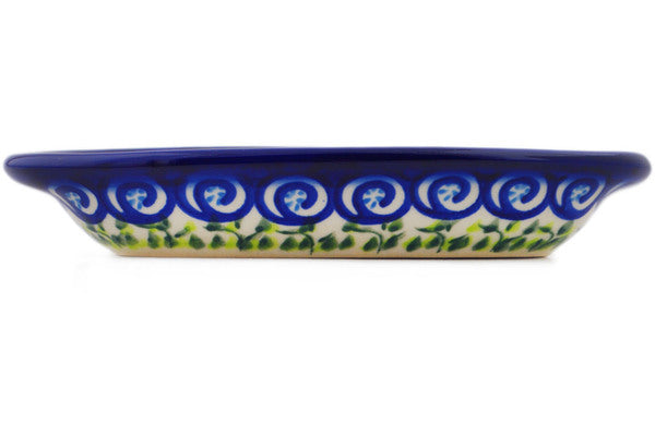 This Polish Pottery Condiment Dish is handmade and handpainted by the Ceramika Bona factory in Boleslawiec, Poland. Manufacturer item number H9832Q. It is 1¼" high and measures 7¼" by 3¾". The capacity of this Condiment Dish is 5.58 oz (brimful) and it weighs 0.5 lbs. It is part of the Gorgeous Morning Glory Collection.