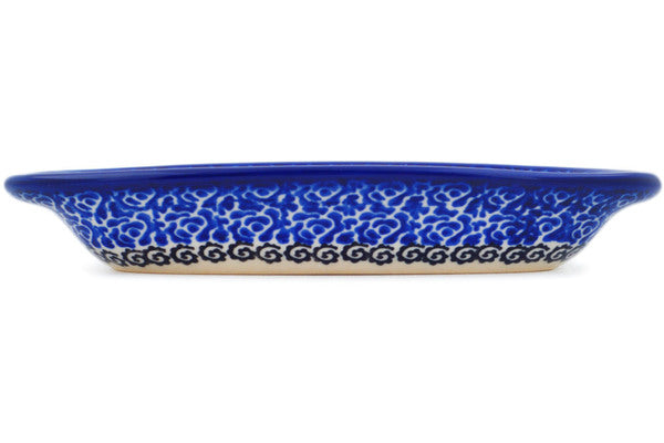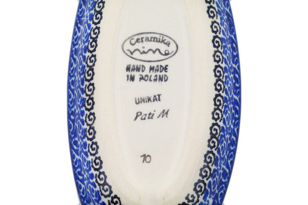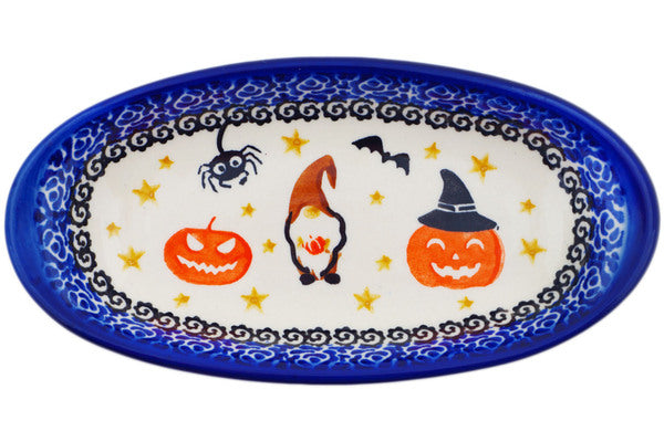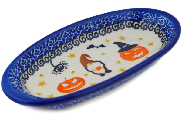 This Polish Pottery Condiment Dish is handmade and handpainted by the Ceramika Nina factory in Boleslawiec, Poland. Manufacturer item number H1543P. It is 1¼" high and measures 7¼" by 3¾". The capacity of this Condiment Dish is 5.58 oz (brimful) and it weighs 0.5 lbs. It is part of the Harvest Haunt Collection.