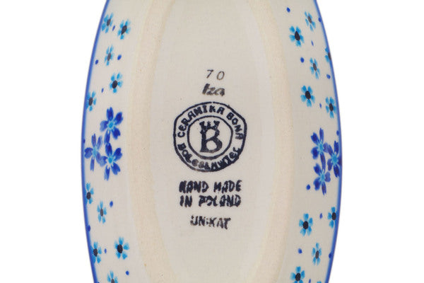 This Polish Pottery Condiment Dish is handmade and handpainted by the Ceramika Bona factory in Boleslawiec, Poland. Manufacturer item number H5448P. It is 1¼" high and measures 7¼" by 3¾". The capacity of this Condiment Dish is 5.58 oz (brimful) and it weighs 0.5 lbs. It is part of the Pansy Dawn Collection.