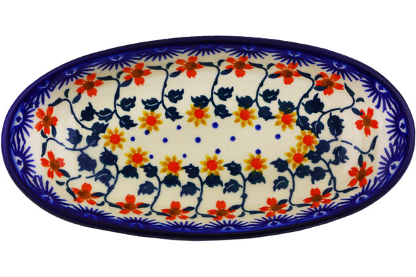 This Polish Pottery Condiment Dish is handmade and handpainted by the Ceramika Bona factory in Boleslawiec, Poland. Manufacturer item number H9166I. It is 1¼" high and measures 7¼" by 3¾". The capacity of this Condiment Dish is 5.58 oz (brimful) and it weighs 0.5 lbs. It is part of the Red Sunflower Collection.