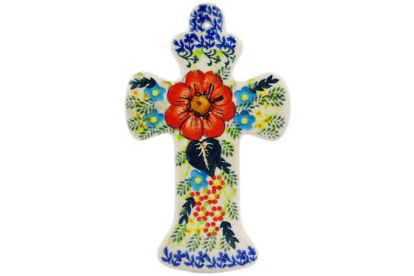 This Polish Pottery Cross is handmade and handpainted by the Ceramika Bona factory in Boleslawiec, Poland. Manufacturer item number H6562F. It is ¼" high and measures 7½" by 4½". The weight of this Cross is 0.4 lbs. It is part of the Bold Red Poppies Collection.