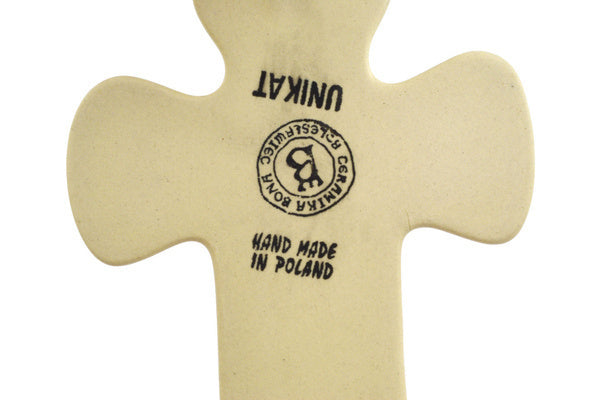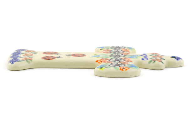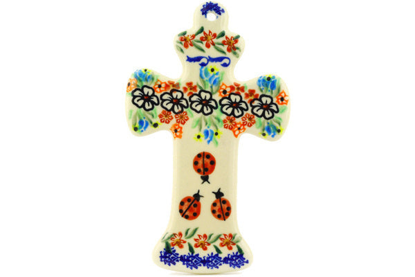 This Polish Pottery Cross is handmade and handpainted by the Ceramika Bona factory in Boleslawiec, Poland. Manufacturer item number H8354F. It is ¼" high and measures 7½" by 4½". The weight of this Cross is 0.4 lbs. It is part of the Fanciful Ladybug Collection.