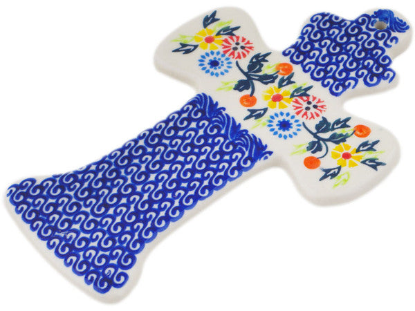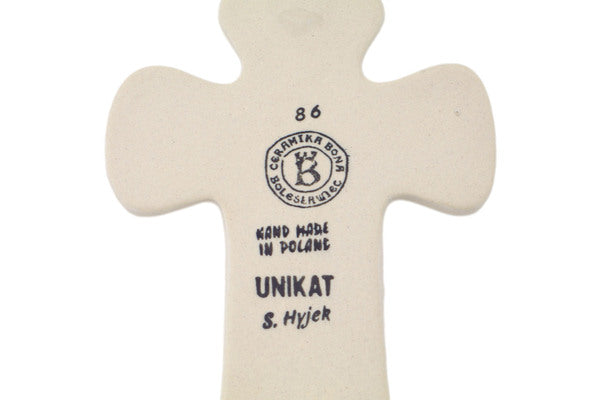 This Polish Pottery Cross is handmade and handpainted by the Ceramika Bona factory in Boleslawiec, Poland. Manufacturer item number H1922R. It is ¼" high and measures 7½" by 4½". The weight of this Cross is 0.4 lbs. It is part of the Pastel Spring Wreath Collection.