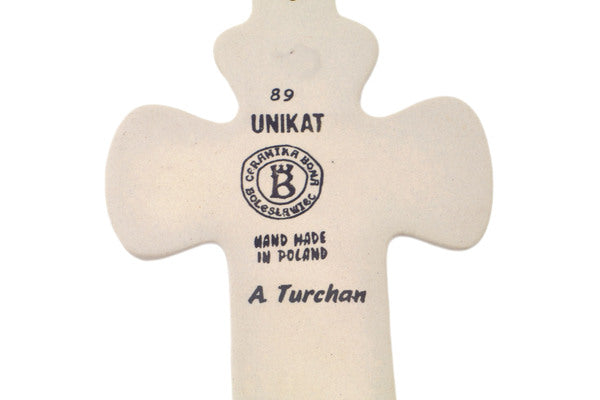 This is a Polish pottery Unikat (Signature) Cross, which means that it has been hand painted with both sponges and brushes and it is signed by the artist who painted it. Unikat pieces are the most intricate works of art. Larger Unikat items take hours of very careful work to finish.