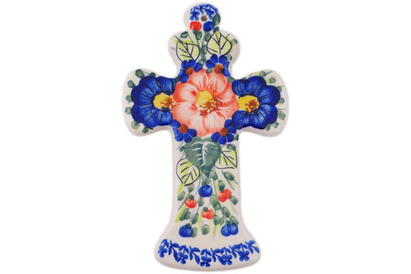 This Polish Pottery Cross is handmade and handpainted by the Ceramika Bona factory in Boleslawiec, Poland. Manufacturer item number H7163Q. It is ¼" high and measures 7½" by 4½". The weight of this Cross is 0.4 lbs. It is part of the Poppy Trio Collection.