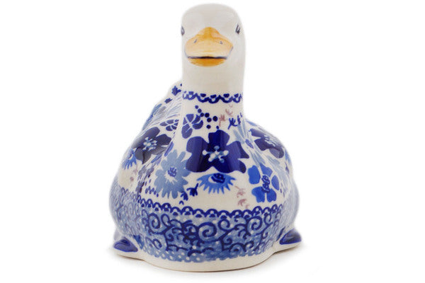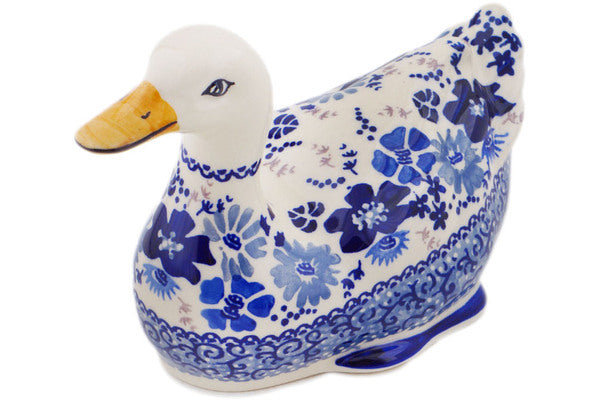 This Polish Pottery Duck Figurine is handmade and handpainted by the Manufaktura factory in Boleslawiec, Poland. Manufacturer item number H8381P. It is 4¾" high and measures 7¼" by 3¾". The weight of this Duck Figurine is 0.9 lbs. It is part of the Periwinkle Sweetness Collection.