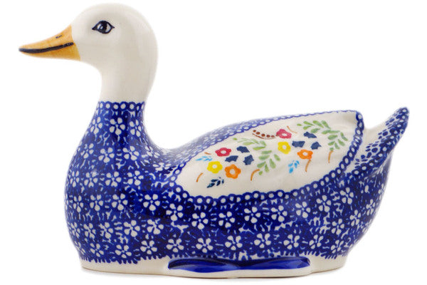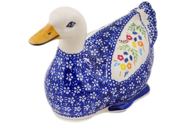 This Polish Pottery Duck Figurine is handmade and handpainted by the Manufaktura factory in Boleslawiec, Poland. Manufacturer item number H8517P. It is 4¾" high and measures 7¼" by 3¾". The weight of this Duck Figurine is 0.9 lbs. It is part of the Rainbow Delight Collection.