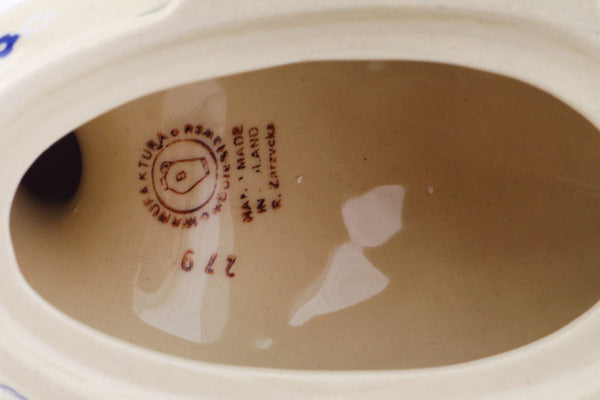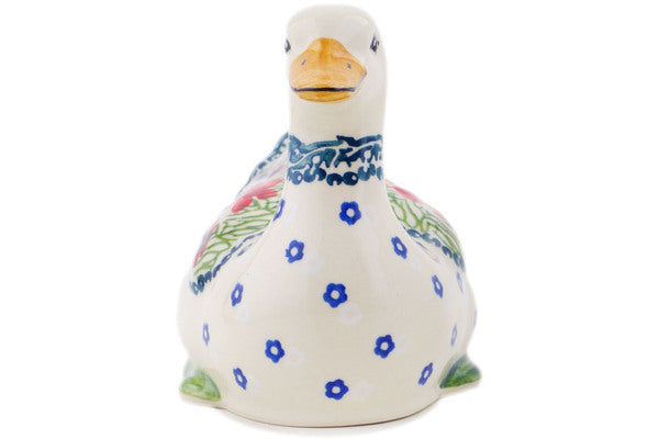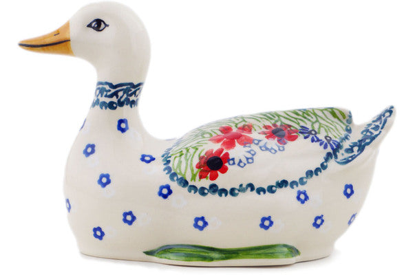 This Polish Pottery Duck Figurine is handmade and handpainted by the Manufaktura factory in Boleslawiec, Poland. Manufacturer item number H7501P. It is 4¾" high and measures 7¼" by 3¾". The weight of this Duck Figurine is 0.9 lbs. It is part of the Red Blossom Collection.