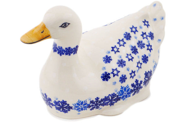 This Polish Pottery Duck Figurine is handmade and handpainted by the Manufaktura factory in Boleslawiec, Poland. Manufacturer item number H7320P. It is 4¾" high and measures 7¼" by 3¾". The weight of this Duck Figurine is 0.9 lbs. It is part of the Snowdrift Collection.