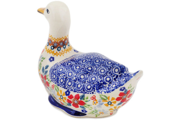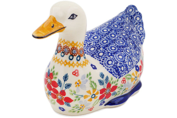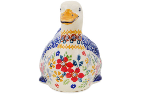 This Polish Pottery Duck Figurine is handmade and handpainted by the Manufaktura factory in Boleslawiec, Poland. Manufacturer item number H7337P. It is 4¾" high and measures 7¼" by 3¾". The weight of this Duck Figurine is 0.9 lbs. It is part of the Summer Bouquet Collection.