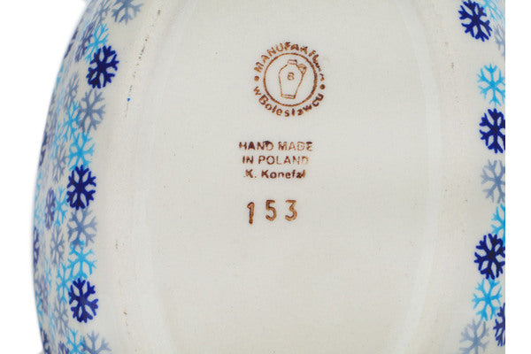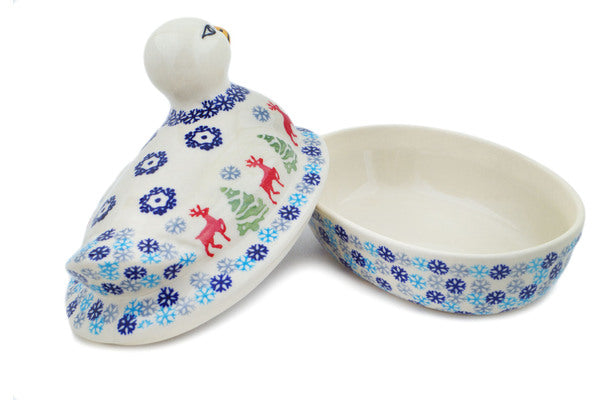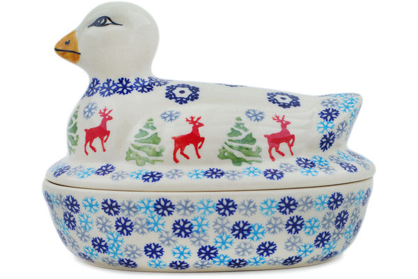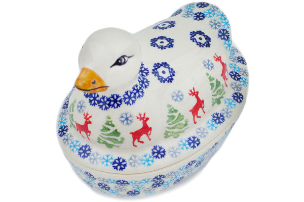 This Polish Pottery Duck Shaped Jar is handmade and handpainted by the Manufaktura factory in Boleslawiec, Poland. Manufacturer item number H8210N. It is 5¼" high and measures 7" by 5". The capacity of this Duck Shaped Jar is 10.65 oz (brimful) and it weighs 1.8 lbs. It is part of the Ring Around The Reindeer Collection.
