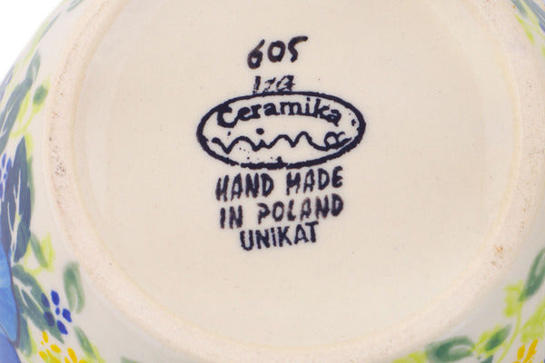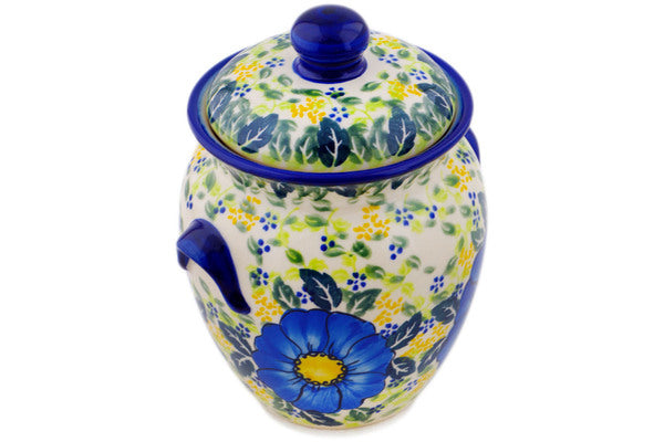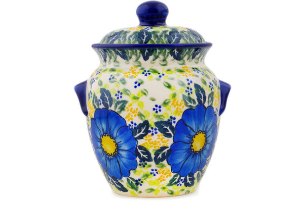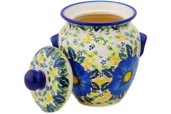 This Polish Pottery Jar with Lid and Handles is handmade and handpainted by the Ceramika Nina factory in Boleslawiec, Poland. Manufacturer item number H0648P. It is 7¼" high and measures 6" by 5¼". The capacity of this Jar with Lid and Handles is 36.62 oz (brimful) and it weighs 2.3 lbs. It is part of the Blue Happy Fields Collection.
