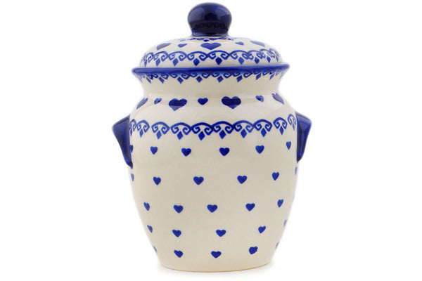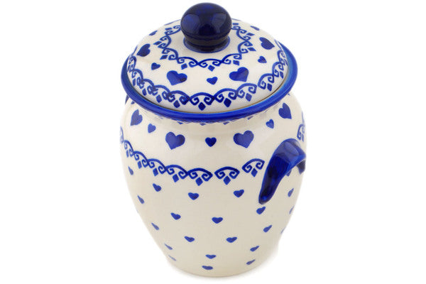 This Polish Pottery Jar with Lid and Handles is handmade and handpainted by the Ceramika Bona factory in Boleslawiec, Poland. Manufacturer item number H5083P. It is 7¼" high and measures 5½" by 4¾". The capacity of this Jar with Lid and Handles is 30.70 oz (brimful) and it weighs 1.8 lbs. It is part of the Blue Valentine Hearts Collection.