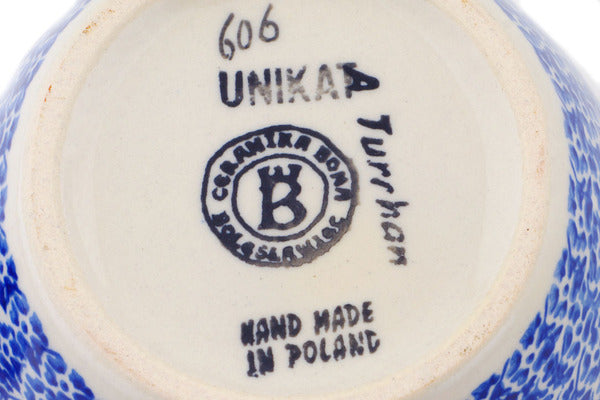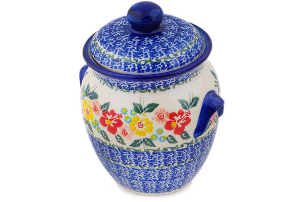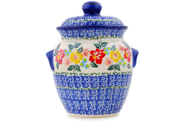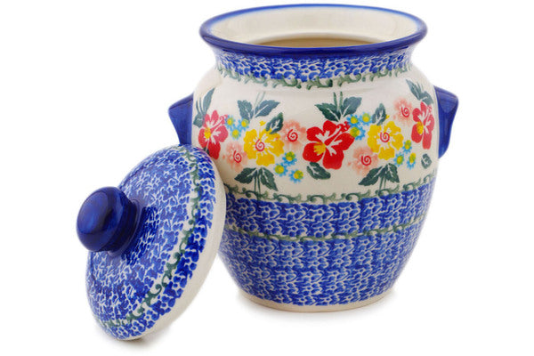 This Polish Pottery Jar with Lid and Handles is handmade and handpainted by the Ceramika Bona factory in Boleslawiec, Poland. Manufacturer item number H0296Q. It is 7¼" high and measures 6" by 5¼". The capacity of this Jar with Lid and Handles is 36.62 oz (brimful) and it weighs 2.3 lbs. It is part of the Hibiscus Haven Collection.