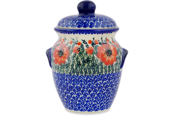 This Polish Pottery Jar with Lid and Handles is handmade and handpainted by the Ceramika Bona factory in Boleslawiec, Poland. Manufacturer item number H8632P. It is 7¼" high and measures 5½" by 4¾". The capacity of this Jar with Lid and Handles is 30.70 oz (brimful) and it weighs 1.8 lbs. It is part of the Lone Poppy Collection.