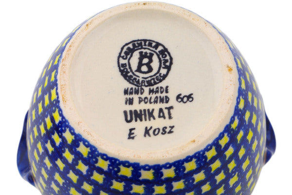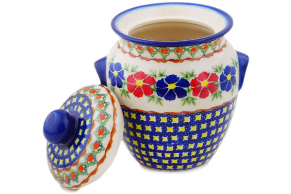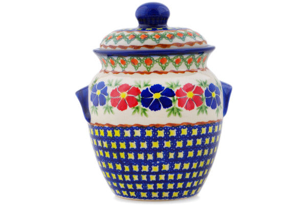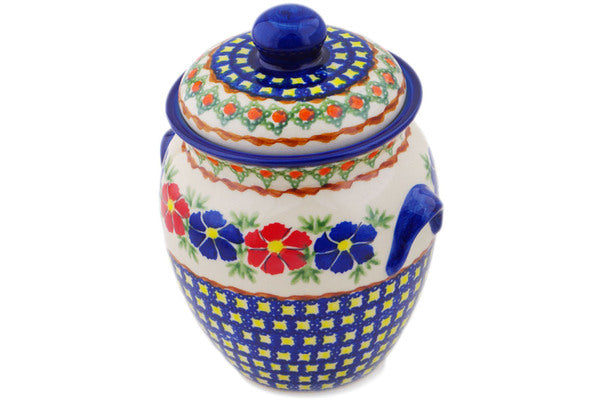 This Polish Pottery Jar with Lid and Handles is handmade and handpainted by the Ceramika Bona factory in Boleslawiec, Poland. Manufacturer item number H1909Q. It is 7¼" high and measures 6" by 5¼". The capacity of this Jar with Lid and Handles is 36.62 oz (brimful) and it weighs 2.3 lbs. It is part of the Paradise Poppy Collection.