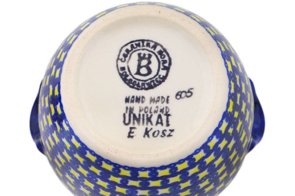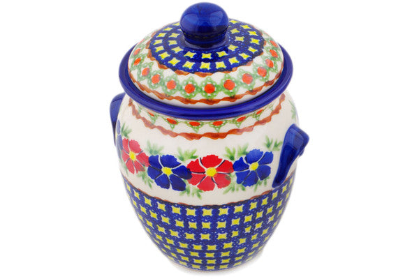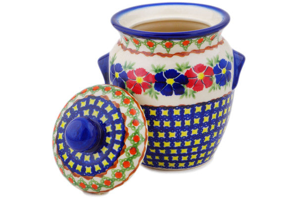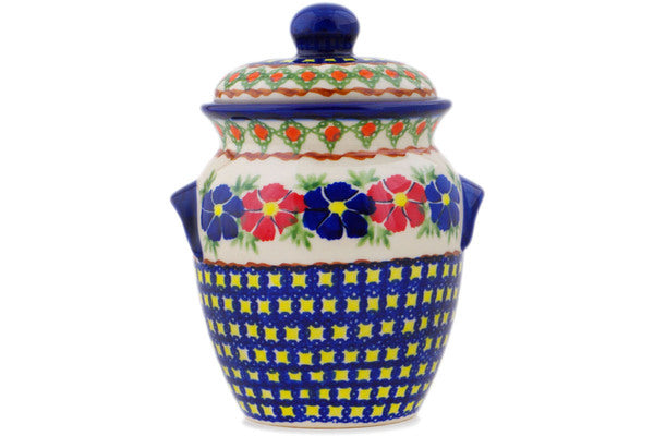 This Polish Pottery Jar with Lid and Handles is handmade and handpainted by the Ceramika Bona factory in Boleslawiec, Poland. Manufacturer item number H1910Q. It is 7¼" high and measures 5½" by 4¾". The capacity of this Jar with Lid and Handles is 30.70 oz (brimful) and it weighs 1.8 lbs. It is part of the Paradise Poppy Collection.