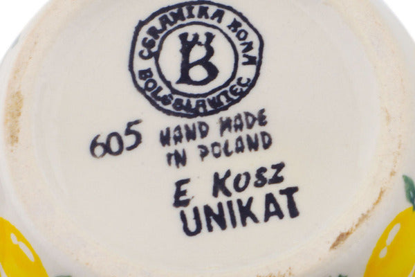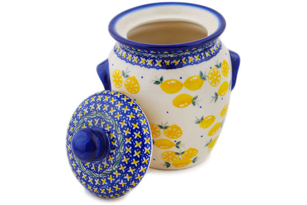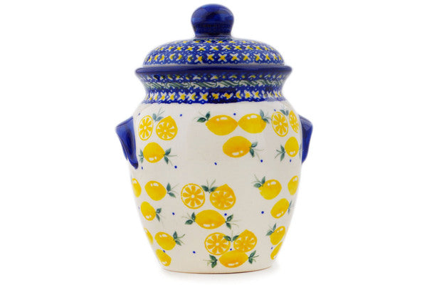 This Polish Pottery Jar with Lid and Handles is handmade and handpainted by the Ceramika Bona factory in Boleslawiec, Poland. Manufacturer item number H9657O. It is 7¼" high and measures 5½" by 4¾". The capacity of this Jar with Lid and Handles is 30.70 oz (brimful) and it weighs 1.8 lbs. It is part of the When Life Gives You Lemons Collection.