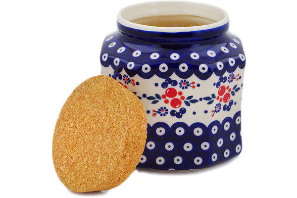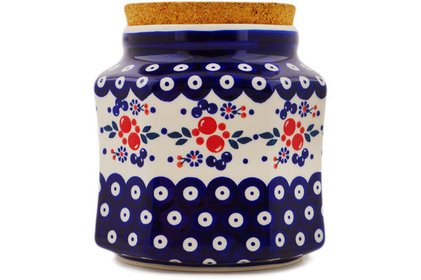 This Polish Pottery Jar with Lid is handmade and handpainted by the Manufaktura factory in Boleslawiec, Poland. Manufacturer item number H0053Q. It is 6¾" high and measures 6¼" by 5¾". The capacity of this Jar with Lid is 62.76 oz (brimful) and it weighs 2.5 lbs. It is part of the Burst Of Berries Collection.