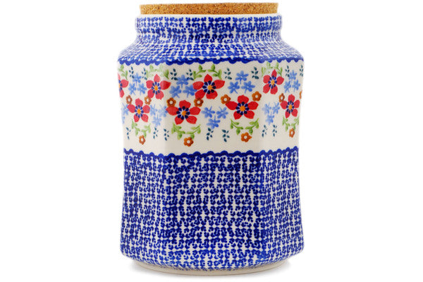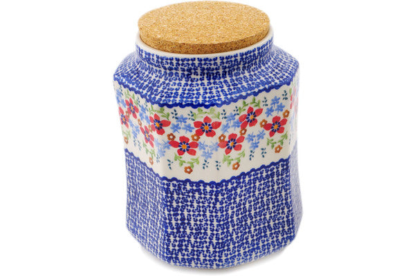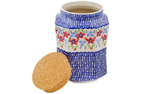 This Polish Pottery Jar with Lid is handmade and handpainted by the Manufaktura factory in Boleslawiec, Poland. Manufacturer item number H0054Q. It is 6¾" high and measures 6¼" by 5¾". The capacity of this Jar with Lid is 62.76 oz (brimful) and it weighs 2.5 lbs. It is part of the Red Flower Meadow Collection.