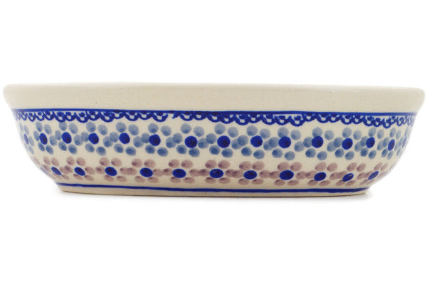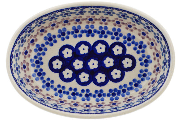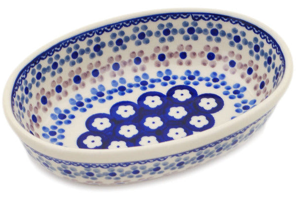 This Polish Pottery Oval Baker is handmade and handpainted by the Manufaktura factory in Boleslawiec, Poland. Manufacturer item number H9125P. It is 1¾" high and measures 7" by 5". The capacity of this Oval Baker is 13.86 oz (brimful) and it weighs 0.8 lbs. It is part of the Soul Fusion Collection.