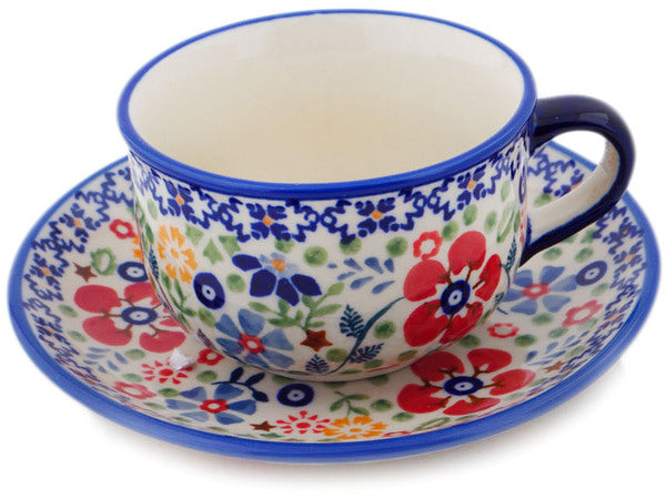 This Polish Pottery Cup with Saucer is handmade and handpainted by the Manufaktura factory in Boleslawiec, Poland. Manufacturer item number H8458P. It is 2¾" high and measures 5¾" by 5¾". The capacity of this Cup with Saucer is 6.63 oz (brimful) and it weighs 1.1 lbs. It is part of the Botanical Sprinkles Collection.