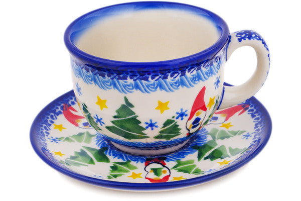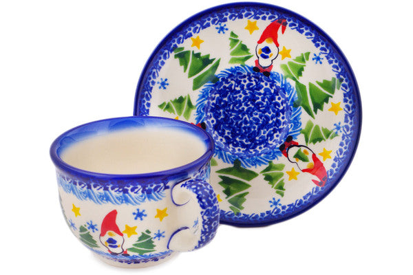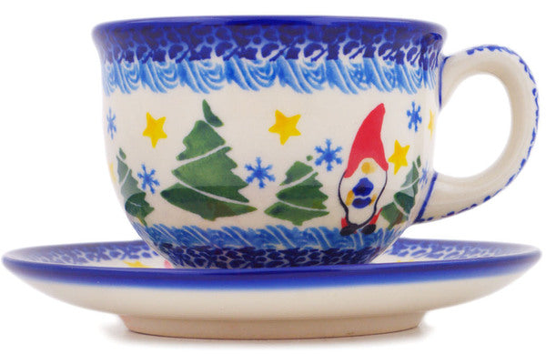 This Polish Pottery Cup with Saucer is handmade and handpainted by the Ceramika Nina factory in Boleslawiec, Poland. Manufacturer item number H1758R. It is 3¼" high and measures 5½" by 5½". The capacity of this Cup with Saucer is 7.44 oz (brimful) and it weighs 1.0 lbs. It is part of the Twinkle Twinkle Little Gnome Collection.