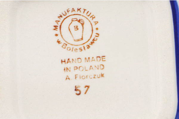 This Polish Pottery Sugar Bowl is handmade and handpainted by the Manufaktura factory in Boleslawiec, Poland. Manufacturer item number H6924O. It is 3½" high and measures 4¼" by 3¾". The capacity of this Sugar Bowl is 7.10 oz (brimful) and it weighs 0.6 lbs. It is part of the Peacock Forget-Me-Not Collection.