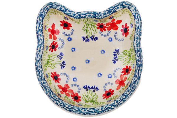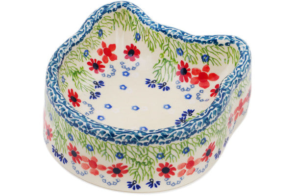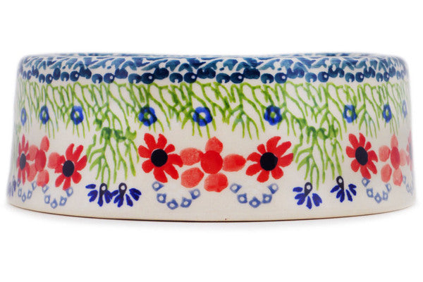 This Polish Pottery Pet Bowl is handmade and handpainted by the Manufaktura factory in Boleslawiec, Poland. Manufacturer item number H7517P. It is 2¼" high and measures 6¾" by 6¼". The capacity of this Pet Bowl is 14.40 oz (brimful) and it weighs 1.5 lbs. It is part of the Red Blossom Collection.
