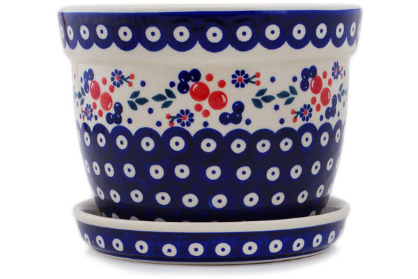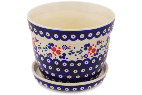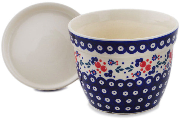 This Polish Pottery Planter is handmade and handpainted by the Manufaktura factory in Boleslawiec, Poland. Manufacturer item number H8335Q. It is 6" high and measures 7¼" by 7¼". The weight of this Planter is 3.5 lbs. It is part of the Burst Of Berries Collection.