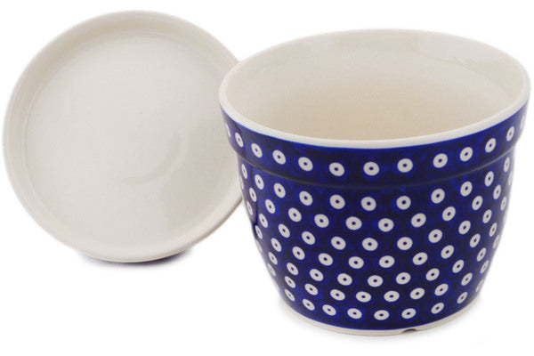This Polish Pottery Planter is handmade and handpainted by the Manufaktura factory in Boleslawiec, Poland. Manufacturer item number H8330Q. It is 6" high and measures 7¼" by 7¼". The weight of this Planter is 3.5 lbs. It is part of the Peacock Eyes Collection.