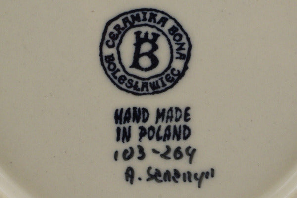 This Polish Pottery Plate is handmade and handpainted by the Ceramika Bona factory in Boleslawiec, Poland. Manufacturer item number H7029J. It is 1" high and measures 7½" by 7½". The weight of this Plate is 0.8 lbs. It is part of the Blue Poppies Collection.
