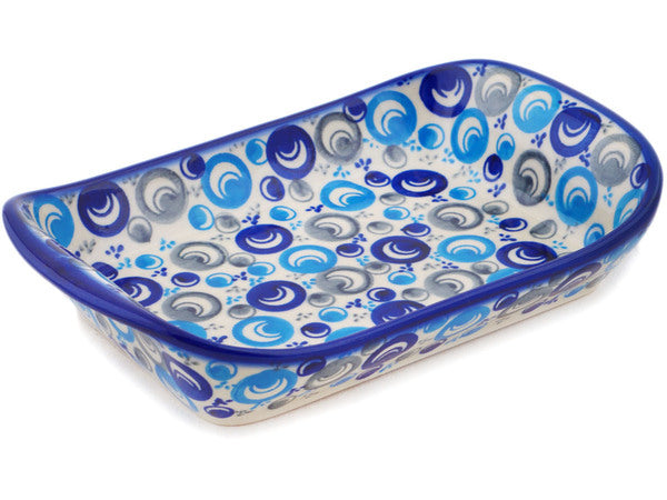 This Polish Pottery Platter with Handles is handmade and handpainted by the Ceramika Bona factory in Boleslawiec, Poland. Manufacturer item number H3142Q. It is 1½" high and measures 7½" by 5". The weight of this Platter with Handles is 1.0 lbs. It is part of the Blue Peacock Eye Collection.
