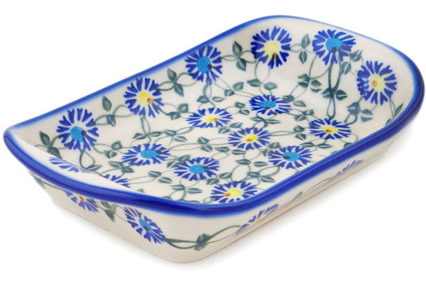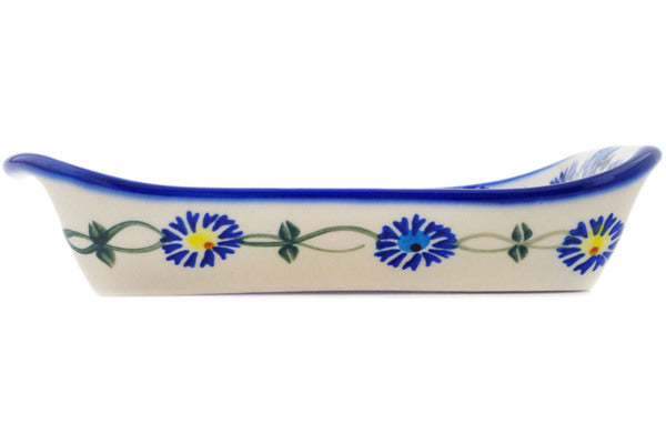 This Polish Pottery Platter with Handles is handmade and handpainted by the Ceramika Bona factory in Boleslawiec, Poland. Manufacturer item number H2219R. It is 1½" high and measures 7½" by 5". The weight of this Platter with Handles is 1.0 lbs. It is part of the Blue Thistle Beauty Collection.