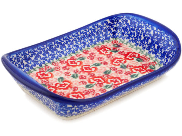 This Polish Pottery Platter with Handles is handmade and handpainted by the Ceramika Bona factory in Boleslawiec, Poland. Manufacturer item number H0206P. It is 1½" high and measures 7½" by 5". The weight of this Platter with Handles is 1.0 lbs. It is part of the Fluctuating Pansy's Collection.