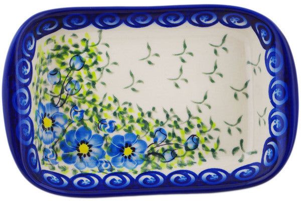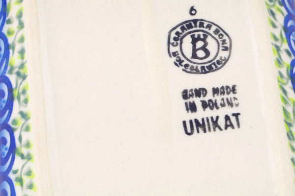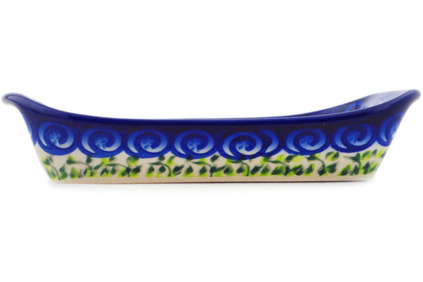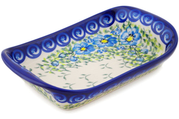 This Polish Pottery Platter with Handles is handmade and handpainted by the Ceramika Bona factory in Boleslawiec, Poland. Manufacturer item number H2091R. It is 1½" high and measures 7½" by 5". The weight of this Platter with Handles is 1.0 lbs. It is part of the Gorgeous Morning Glory Collection.
