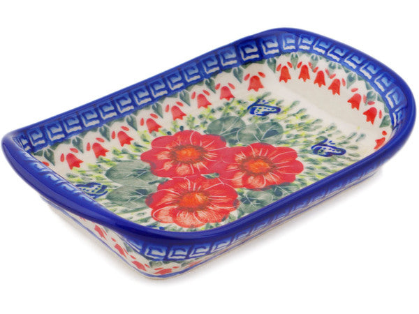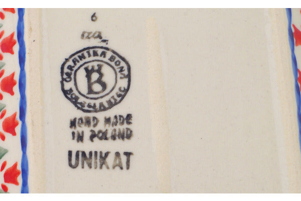 This Polish Pottery Platter with Handles is handmade and handpainted by the Ceramika Bona factory in Boleslawiec, Poland. Manufacturer item number H3143Q. It is 1½" high and measures 7½" by 5". The weight of this Platter with Handles is 1.0 lbs. It is part of the Happiness Collection.