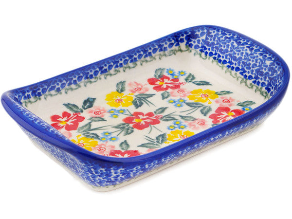 This Polish Pottery Platter with Handles is handmade and handpainted by the Ceramika Bona factory in Boleslawiec, Poland. Manufacturer item number H1856P. It is 1½" high and measures 7½" by 5". The weight of this Platter with Handles is 1.0 lbs. It is part of the Hibiscus Haven Collection.