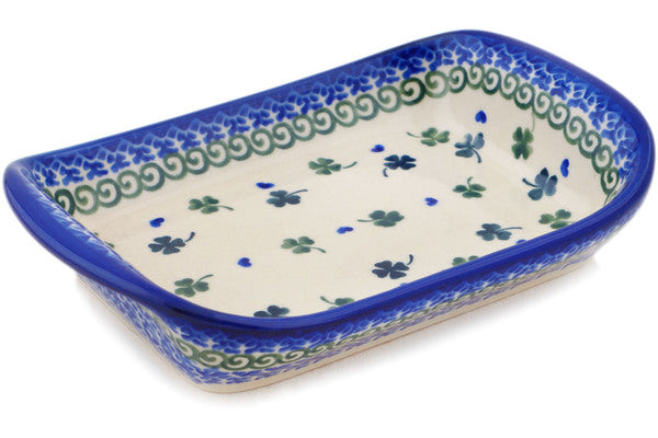 This Polish Pottery Platter with Handles is handmade and handpainted by the Ceramika Bona factory in Boleslawiec, Poland. Manufacturer item number H1967P. It is 1½" high and measures 7½" by 5". The weight of this Platter with Handles is 1.0 lbs. It is part of the Lucky Clovers Collection.