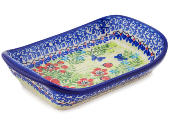 This Polish Pottery Platter with Handles is handmade and handpainted by the Ceramika Bona factory in Boleslawiec, Poland. Manufacturer item number H8776Q. It is 1½" high and measures 7½" by 5". The weight of this Platter with Handles is 1.0 lbs. It is part of the Metamorphosis Collection.