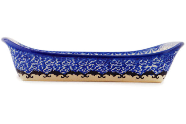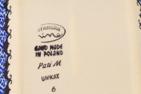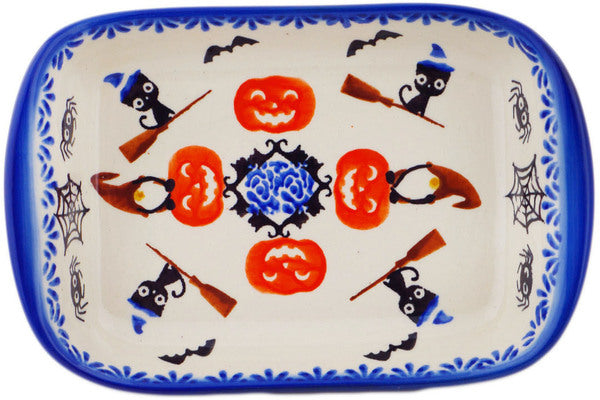 This Polish Pottery Platter with Handles is handmade and handpainted by the Ceramika Bona factory in Boleslawiec, Poland. Manufacturer item number H3252P. It is 1½" high and measures 7½" by 5". The weight of this Platter with Handles is 1.0 lbs. It is part of the Spooky Town Collection.