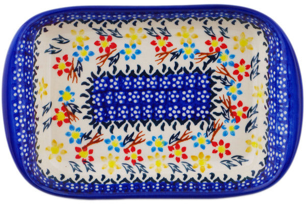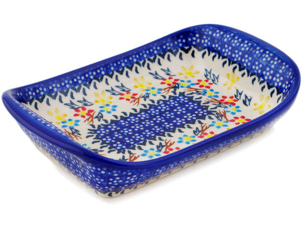 This Polish Pottery Platter with Handles is handmade and handpainted by the Ceramika Bona factory in Boleslawiec, Poland. Manufacturer item number H1970Q. It is 1½" high and measures 7½" by 5". The weight of this Platter with Handles is 1.0 lbs. It is part of the Spring Flower Ring Collection.