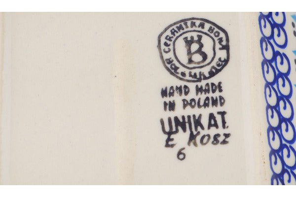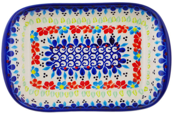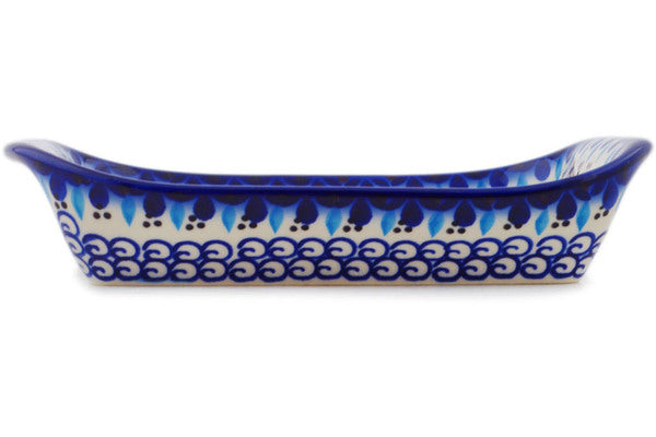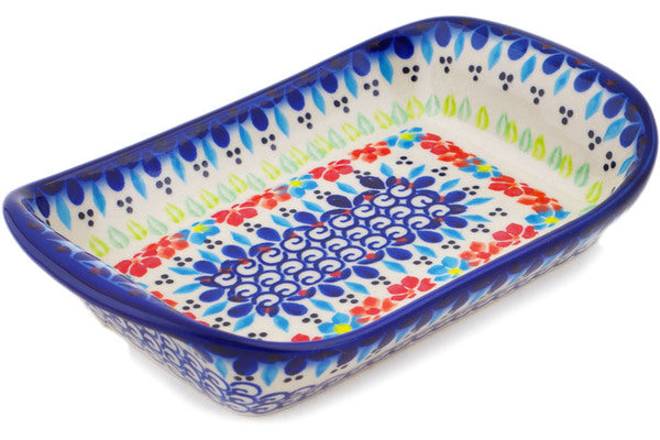 This Polish Pottery Platter with Handles is handmade and handpainted by the Ceramika Bona factory in Boleslawiec, Poland. Manufacturer item number H3059Q. It is 1½" high and measures 7½" by 5". The weight of this Platter with Handles is 1.0 lbs. It is part of the Spring Flowers Collection.